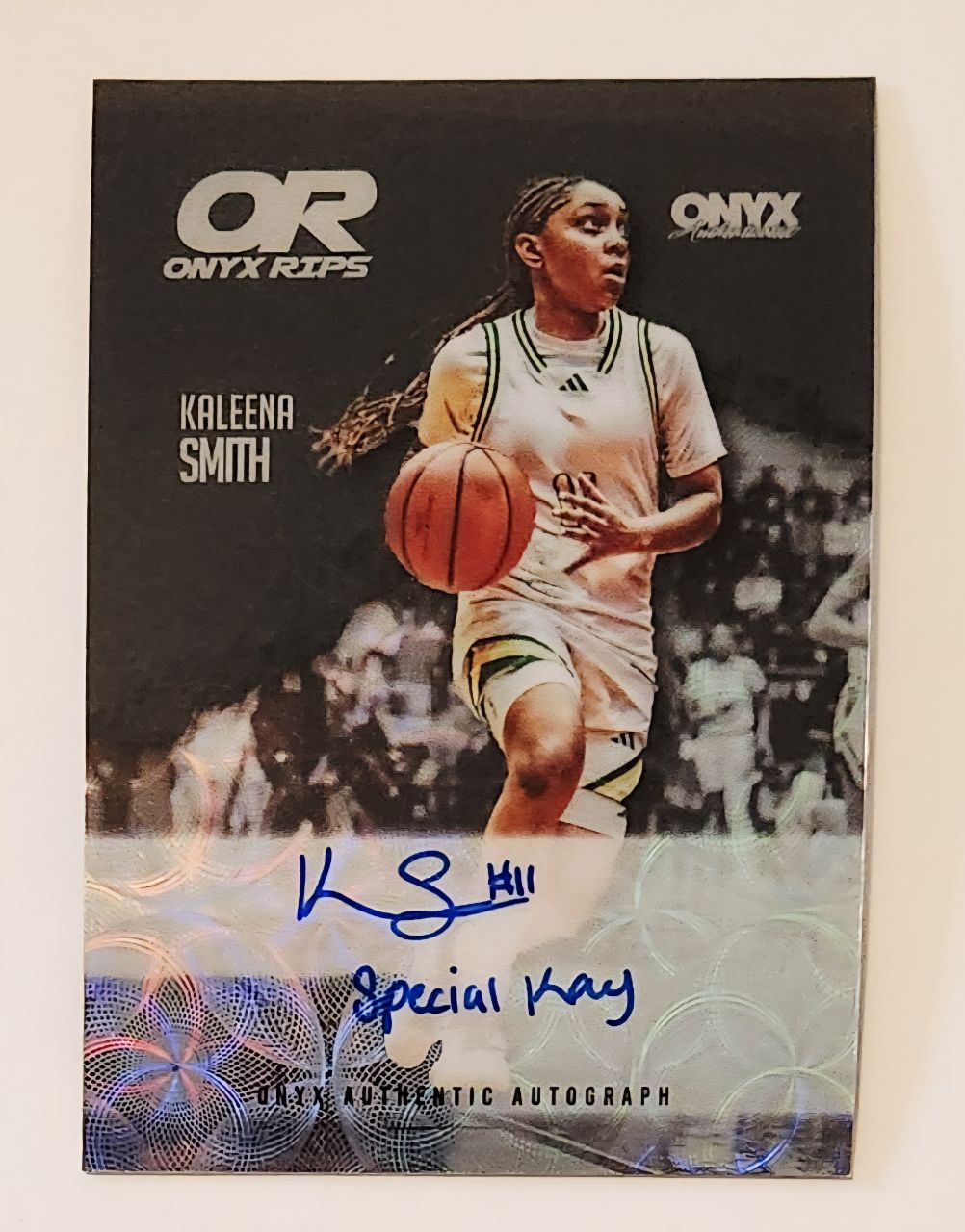 The next women’s basketball prodigy – Kaleena Smith! Introducing her first autographed trading card in the very rare kaleidoscope black version. Numbered to only 5 on the back and inscribed “Special Kay”. Signed in blue ink.