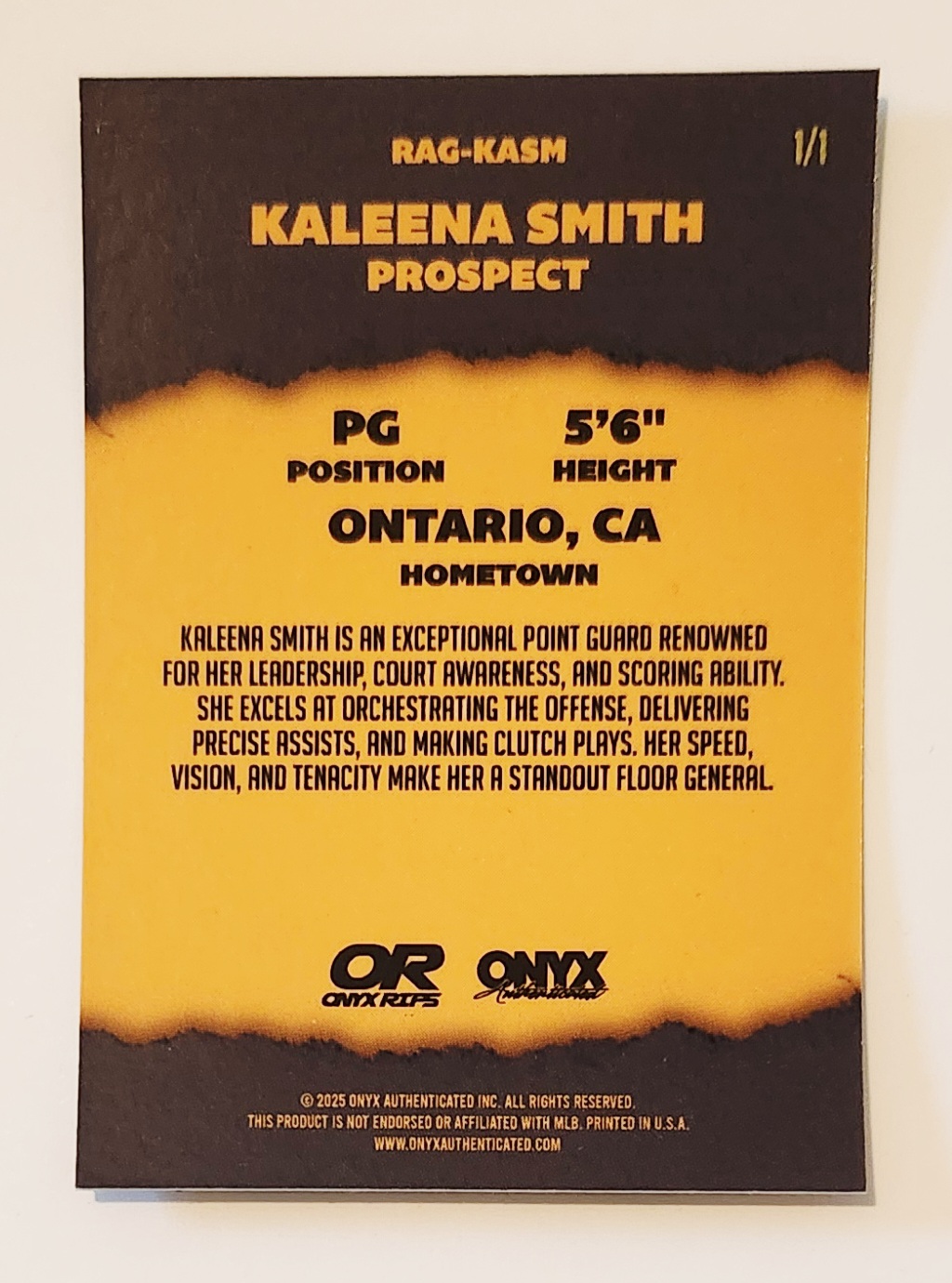 The next women’s basketball prodigy – Kaleena Smith! Introducing her first autographed trading card in the extremely rare kaleidoscope gold version. A true 1 of 1 numbered on the back and inscribed “Special Kay”. Signed in blue ink.