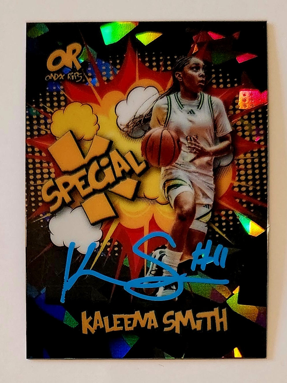 The next women’s basketball prodigy – Kaleena Smith! Introducing her first autographed trading card in the very limited “Rim Shaker” black version. Numbered to 50 on the back, Kaleena autographed the first 15 of this incredible limited variation card in blue paint pen.