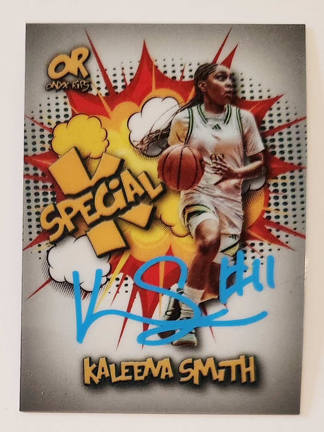 The next women’s basketball prodigy – Kaleena Smith! Introducing her first autographed trading card in the very limited “Rim Shaker” gray version. Numbered to 50 on the back, Kaleena autographed the first 15 of this incredible limited variation card.